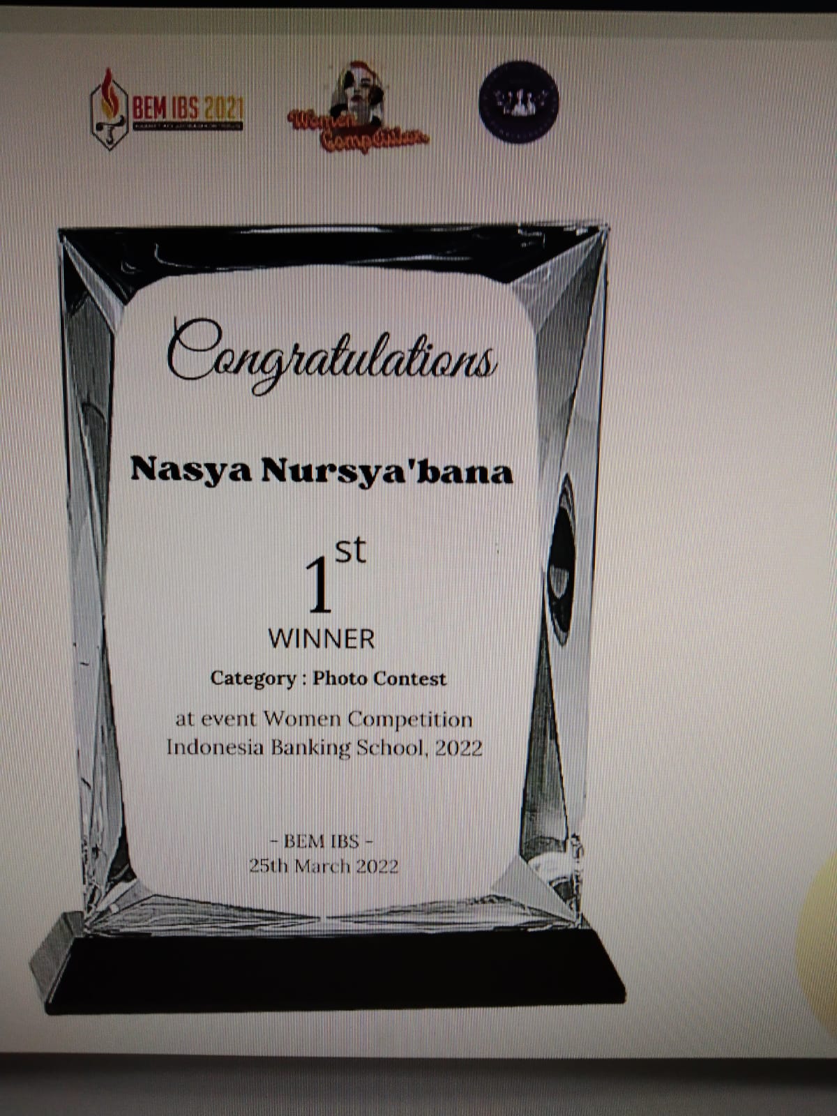 Nasya Nursya'bana Ali kelas XI DKV (Desain Komunikasi Visual) yang telah meraih Juara 1 pada kategori Photo Contest dalam Event Women Competition Indonesia Banking School yang diselenggarakan pada tanggal 14 Maret 2022 dan pemenang diumumkan pada tanggal 25 Maret 2022.