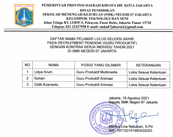 Pengumuman Hasil Akhir Rekrutmen Guru Produktif KKI Tahun 2021 SMKN 67 Jakarta