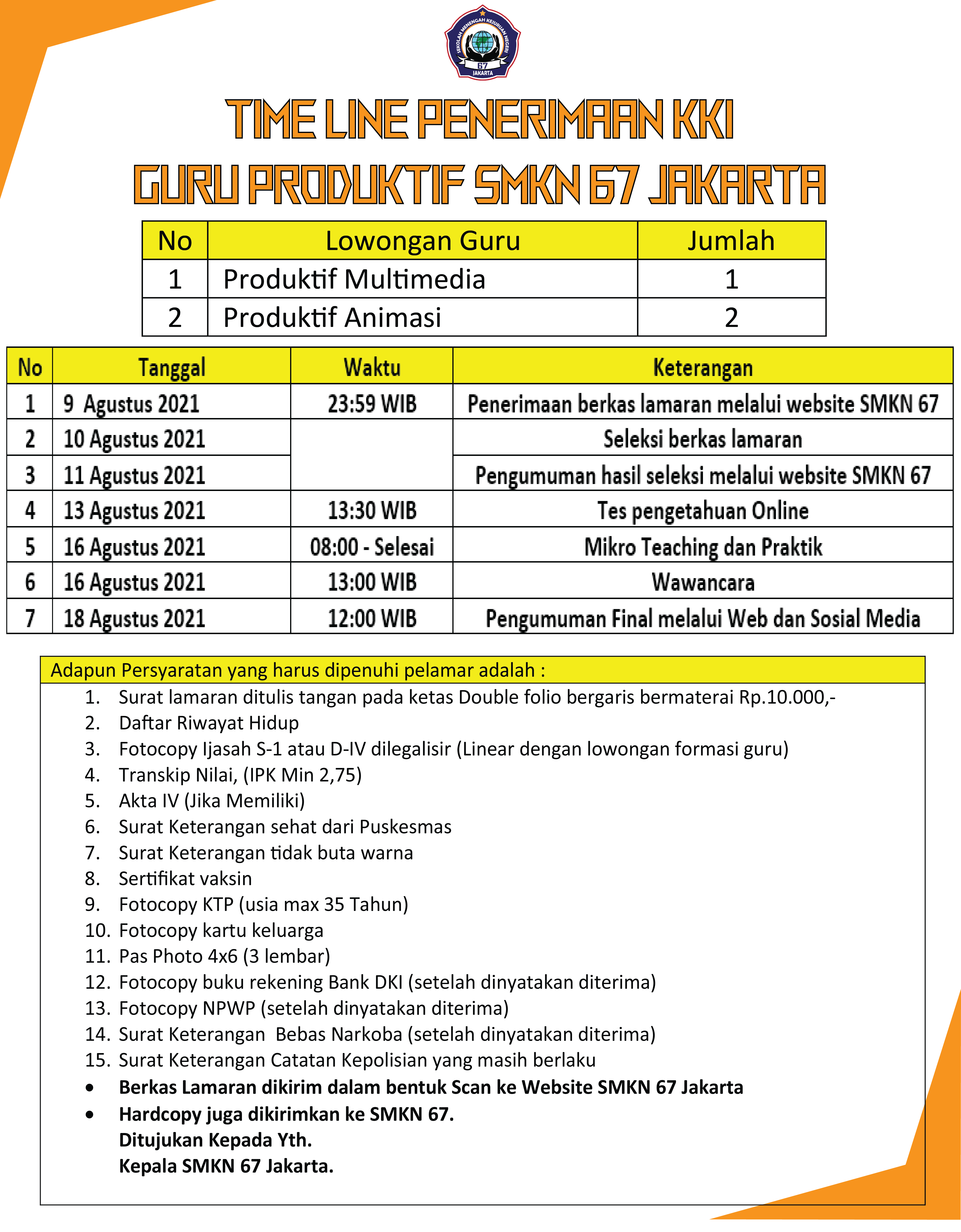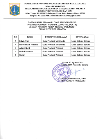 Pengumuman Hasil Seleksi Berkas Rekrutmen Guru Produktif KKI Tahun 2021 SMKN 67 Jakarta